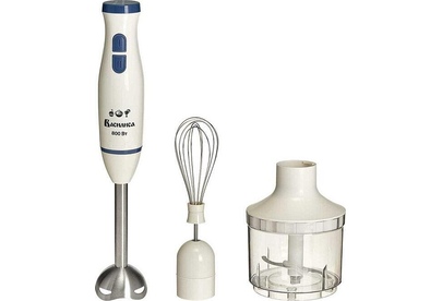 Параметры Максимальная мощность 800 Вт Номинальная потребляемая мощность 400 Вт Объем чаши измельчителя 500 мл Описание Данный электроприбор представляет собой многофункциональное устройство для смешивания, измельчения и взбивания продуктов и жидкостей в бытовых и аналогичных условиях Цвет: белый с синим Насадка и нож из нержавеющей стали Три сменные насадки: насадка для измельчения и смешивания измельчитель венчик для взбивания Петелька для подвешивания Противоскользящие ножки чаши измельчителя Два скоростных режима Автоматическая блокировка при неправильной установке Упаковка: цветная коробка