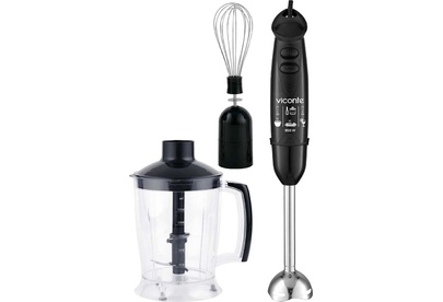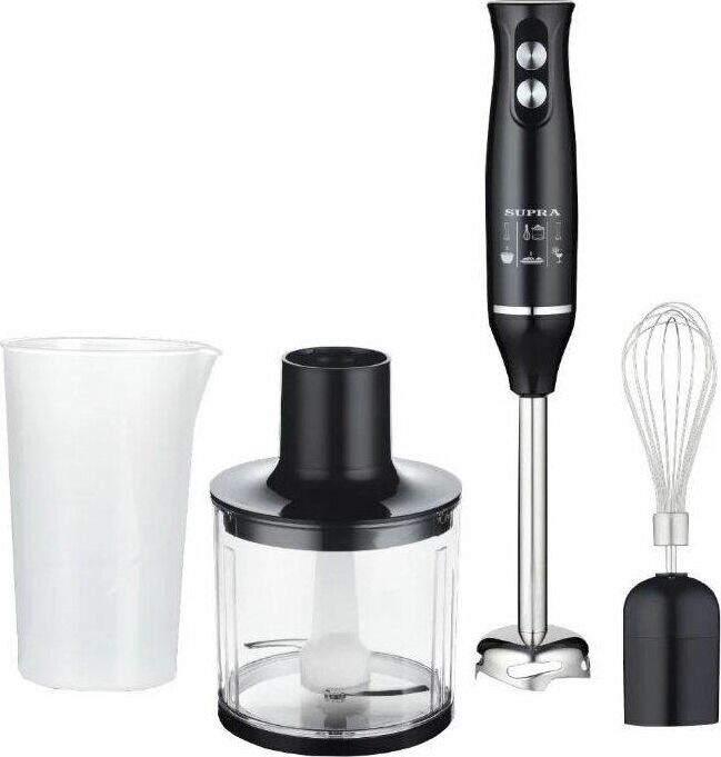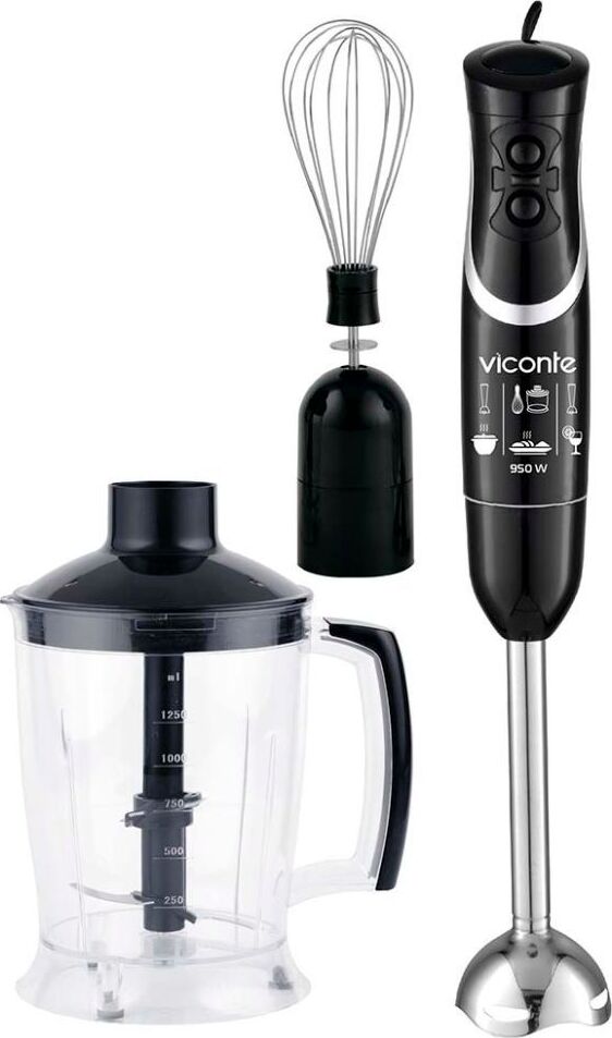 Погружной блендер, мощность 950W, пульсовый режим работы, 2 скорости, металлическая нога блендера, венчик для взбивания, чаша объемом 1250 мл с ножом из 4 лезвий для рубки и измельчения, автоматическая блокировка при неправильно установленной насадке.