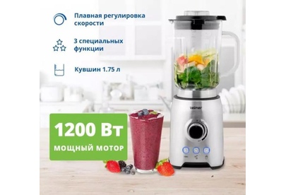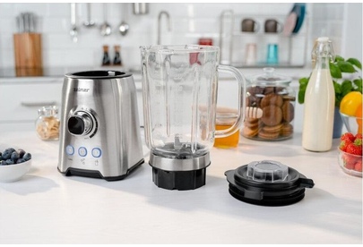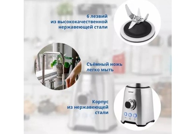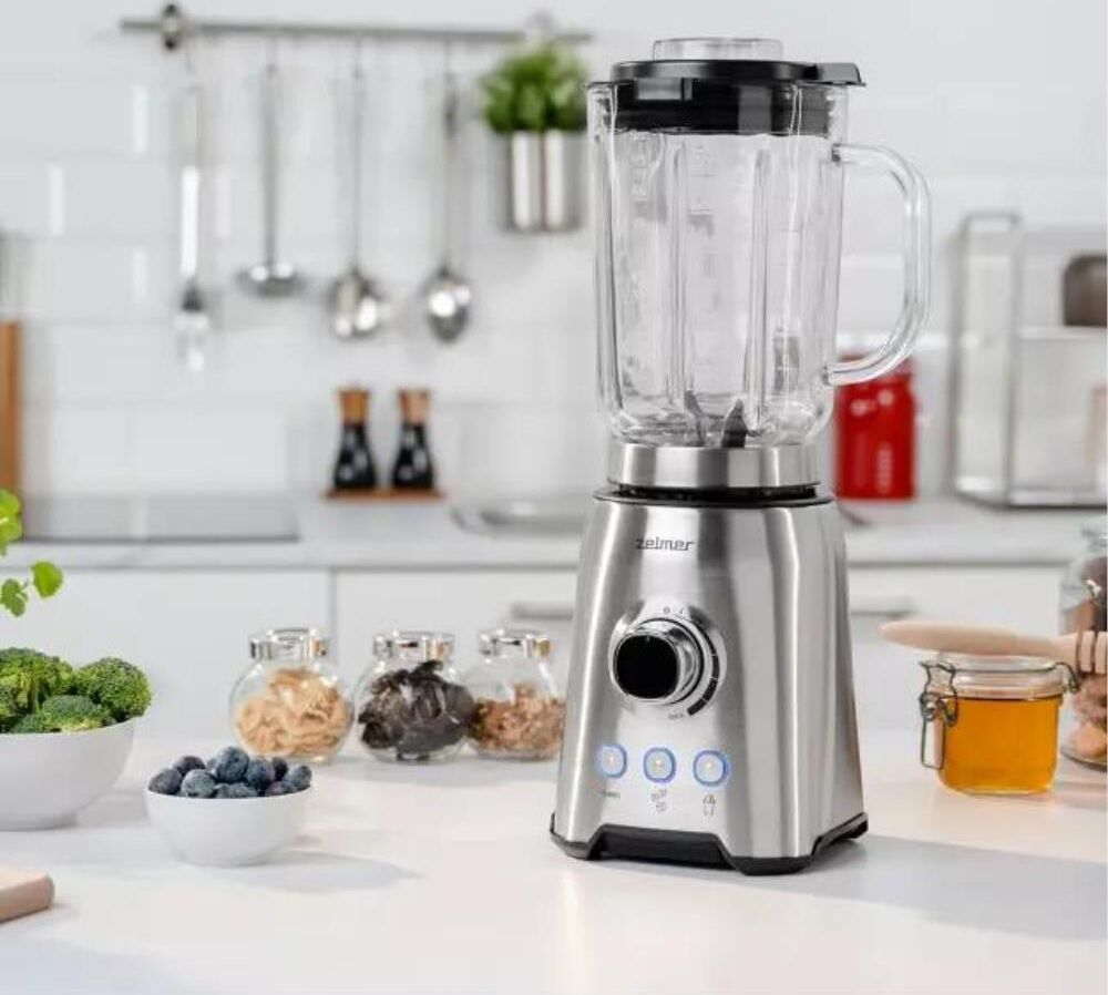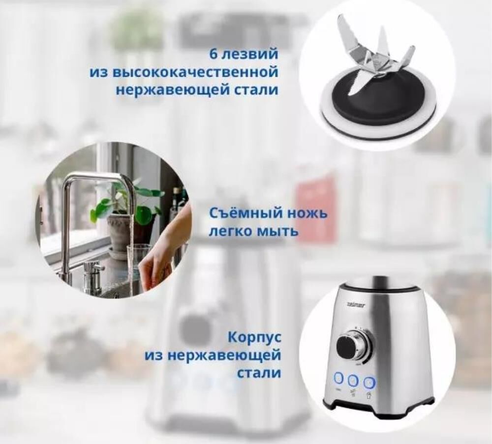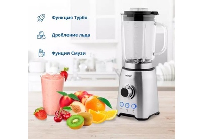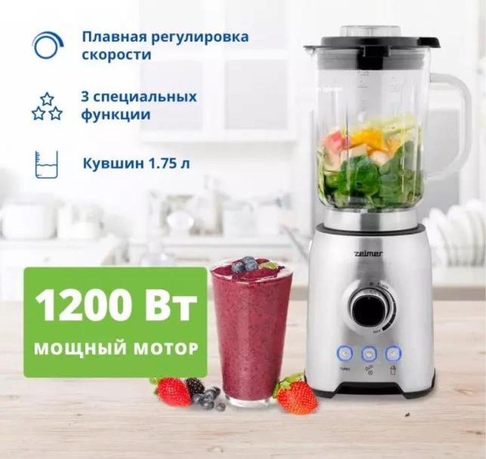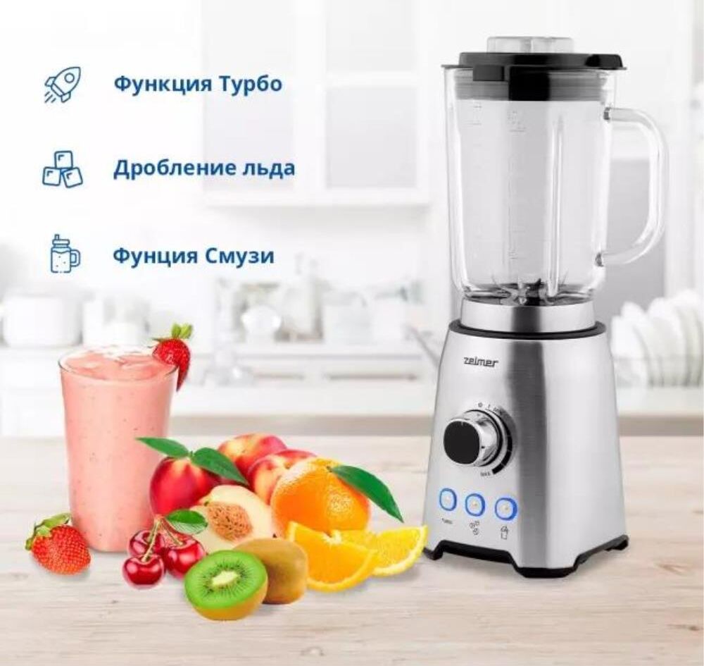 Блендер настольный ZELMER Мощность: 1200Вт; Ёмкость кувшина 1,75 л; 3 скорости + З функции: Турбо режим, Дробление льда, Смузи; Стеклянный кувшин; 6 лезвий из нержавеющей стали; Съемные лезвия для легкой очистки; Противоскользящие ножки.