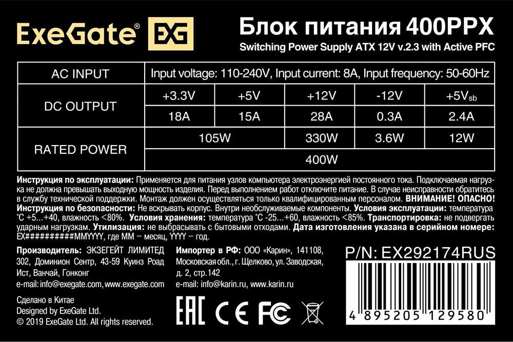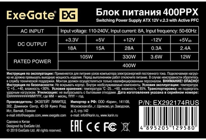 Общее описание Особенности Питание Форм-фактор: ATX 12V v2.3 Входное напряжение, В: 115-253 Максимальная выходная мощность, Вт: 400 Основные характеристики PFC (Корректор фактора мощности): Активный Среднее время наработки на отказ, часов: 120000 Максимальный входной ток, А: 8 Диапазон входных частот, Гц: 47-63 Эффективность, %: 80 (соответствие 80 Plus) Охлаждение Вентилятор, см: 14 Уровень шума, Дб: 23-26 Выходной ток: +3.3B, А: 18 +5B, А: 15 +12B, A: 28 -12B, A: 0,3 +5Bsb, A: 2,4 Мощность