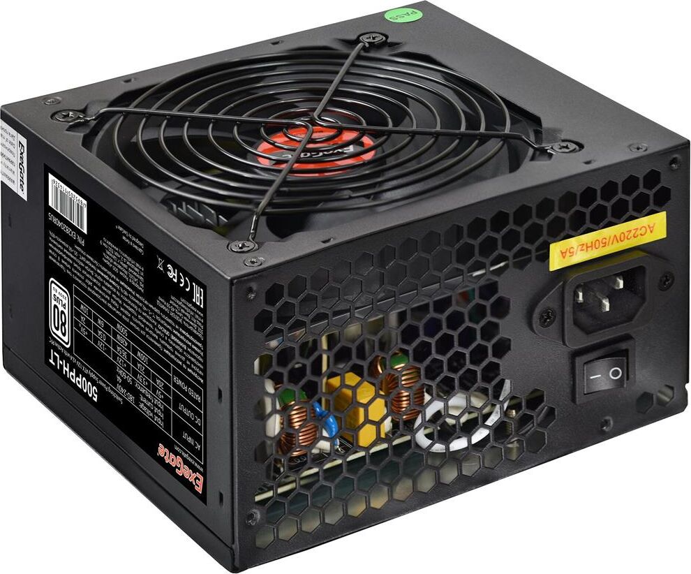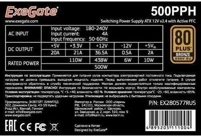 Блок питания 500W ExeGate 80 PLUS® 500PPH-LT-OEM (ATX, APFC, КПД 82% (80 PLUS), 12cm fan, 24pin, (4+4)pin, PCIe, 5xSATA, 3xIDE, black, RTL)