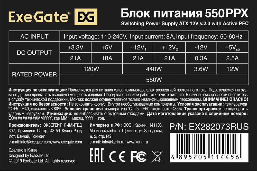 Блок питания EXEGATE 550PPX EX282073RUS