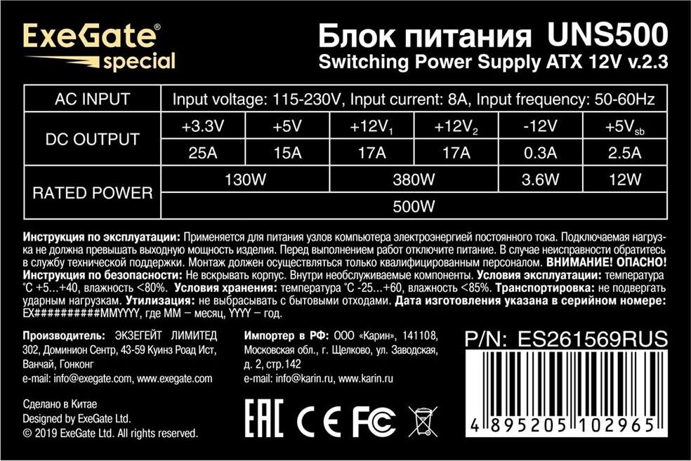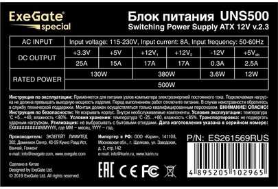 [Блок питания] Exegate ES261569RUS-PC Блок питания 500W ExeGate UNS500 (ATX, PC, 12cm fan, 24pin, 4pin, PCIe, 3xSATA, 2xIDE, кабель 220V в комплекте)
