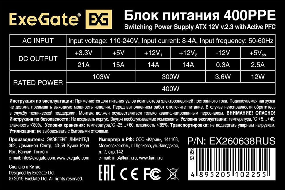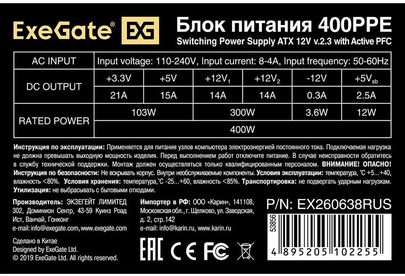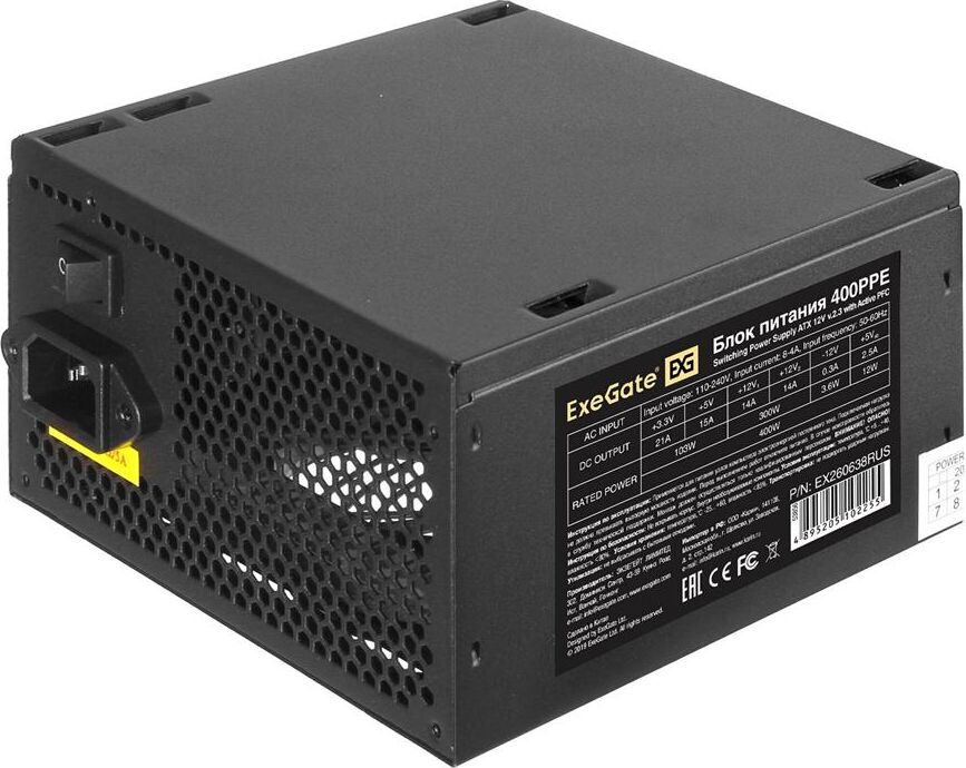 Производитель ExeGate Код производителя EX260638RUS-PC Мощность 400 Вт Стандарт ATX12V 2.3 PFC активный Размер вентилятора 120 мм Разъёмы Тип разъёма для материнской платы 20+4 pin Количество разъёмов 4-pin CPU 1 Количество разъёмов 6+2-pin PCI-E 1 Количество разъёмов 4-pin IDE (Molex) 3 Количество разъёмов 15-pin SATA 5 Количество разъёмов 4-pin Floppy 1 Сила тока Ток по линии +3.3 В 21 A Ток по линии +5 В 15 A Ток по линии +12 В 1 14 A Ток по линии +12 В 2 14 A Ток по линии -12 В 0.3 A Ток по линии +5 В