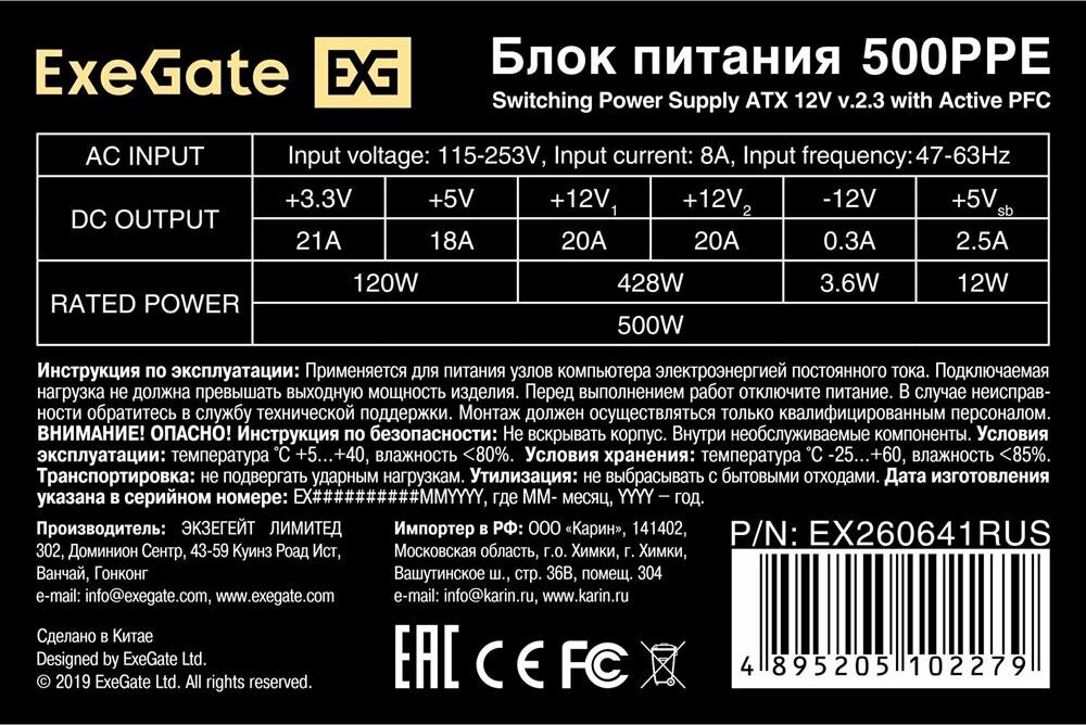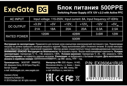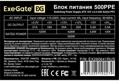 [Блок питания] Exegate EX260641RUS Блок питания 500W Exegate 500PPE, ATX, black, APFC, 12cm, 24p+(4+4)p PCI-E, 3*IDE, 5*SATA, FDD Коннектор питания видеокарт 1x 6/8-pin разъем (разборный 8-pin коннектор, 2-pin отстегивается) Exegate EX260641RUS Блок питания 500W Exegate 500PPE, ATX, black, APFC, 12cm, 24p+(4+4)p PCI-E, 3*IDE, 5*SATA, FDD Основные характеристики Вес (грамм)
