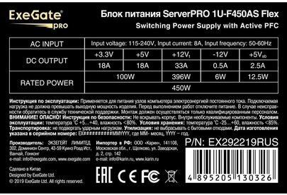 Блок питания Exegate EX292219RUS Серверный БП 450W ExeGate ServerPRO-1U-F450AS (Flex ATX, APFC, КПД 80% (80 PLUS)