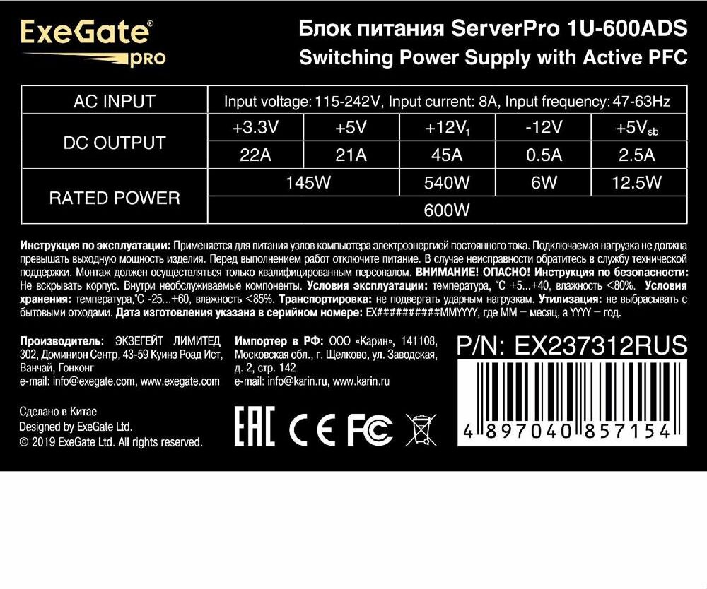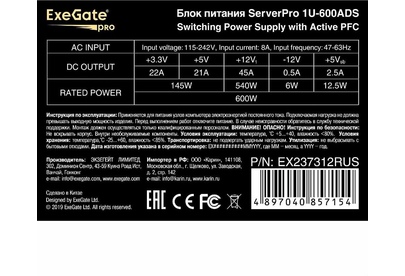 [Блок питания] Exegate EX237312RUS Серверный БП 600W APFC,,универсальный для 1U, 24pin/2x(4+4)pin, 5xSATA,4xIDE