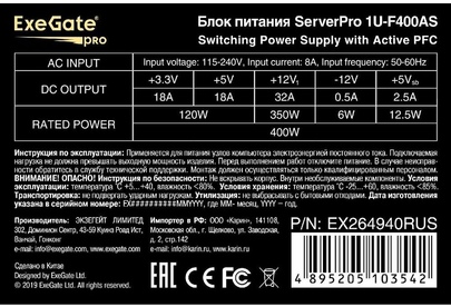 Блок питания EXEGATE ServerPRO-1U-F400AS ( EX264940RUS)
