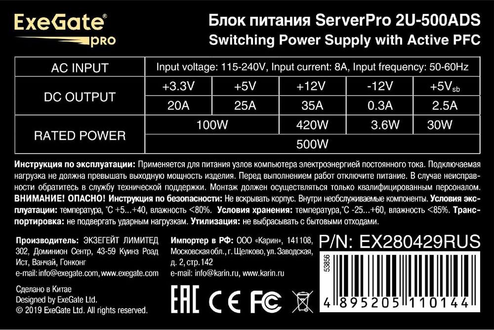 Блок питания EXEGATE ServerPRO-2U-500ADS