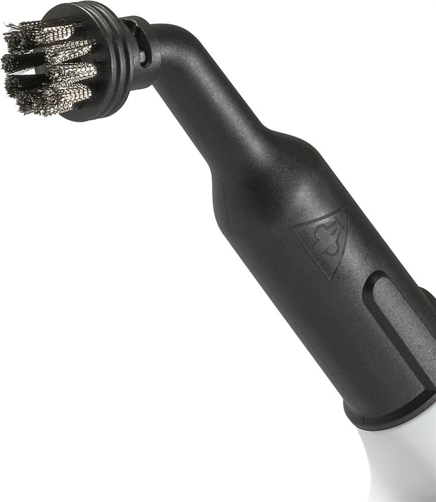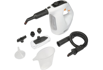 малая круглая щетка-насадка с полимерной щетиной, широкая щетка-насадка с полимерной щетиной, гибкий шланг для подачи пара, насадка для мытья окон/дверей, махровая салфетка