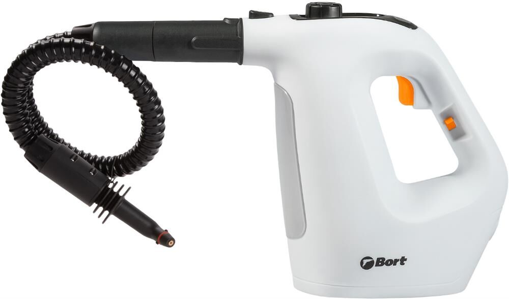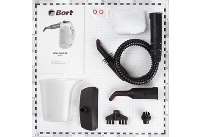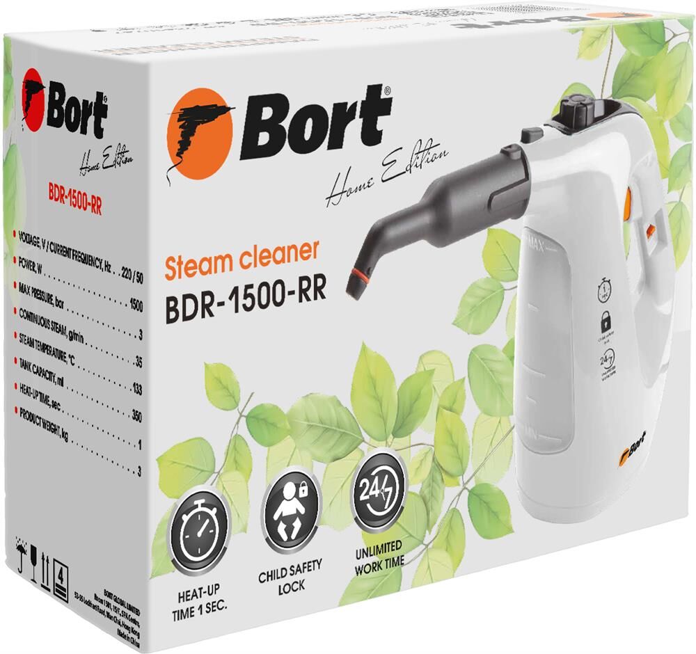 BORT BDR-1500-RR Ключевые характеристики: Brand: BORT. Мощность, Вт: 1 500 Макс давление, бар: 3. Постоянная подача пара, г/мин: 35. Температура пара, °С: 133. Емкость бачка, мл: 350. Время нагревания, с: 1. Время непрерывной работы, мин: 1 000. Регулировка мощности пара: Нет. Длина шланга, м: 0,55. Длина шнура питания, м: 2,7. Размер, мм: 300x125x245