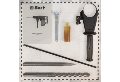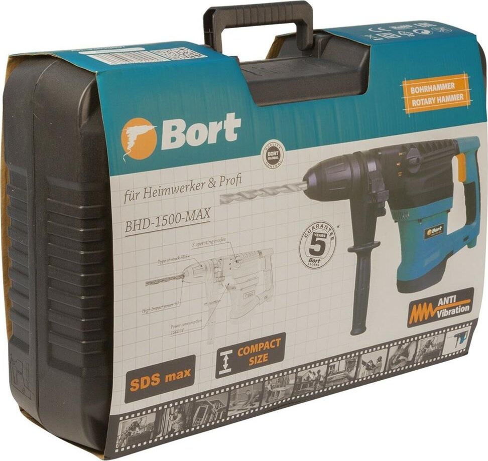 Антивибрационная рукоятка. Вес брутто, кг: 10,76. Вес изделия, кг: 4,4. Вес нетто, кг: 10,76. Габариты упаковки, см: 52 x 16 x 36. Гарантия, г: 2. Длина кабеля, м: 2. Количество ударов в минуту, уд/мин: 1 300...3 200. Модель: BHD-1500-MAX. Потребляемая мощность, Вт: 1 500. Расширенная гарантия, г: 5. Регулировка скорости. Режим долбление. Режим сверление. Режим сверление + удар. Скорость вращения, об/мин: 230. Тип: Перфоратор электрический. Тип патрона: SDS-max. Тип расположения двигателя: Вертикальный. Энергия удара, Дж: 9.