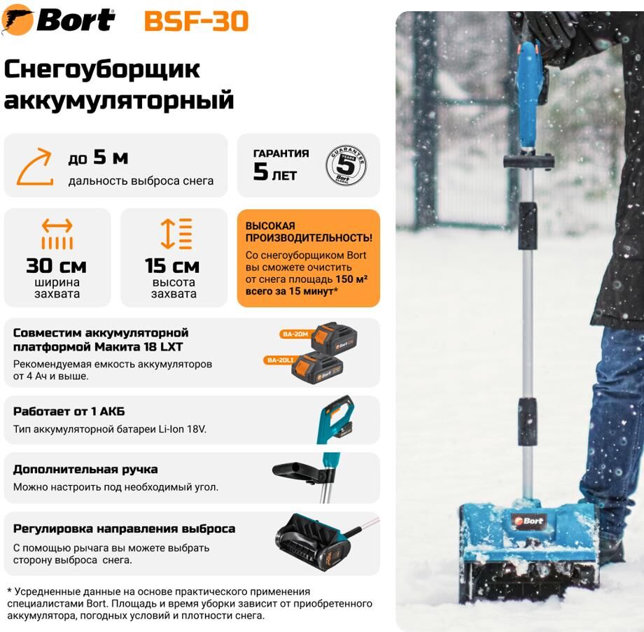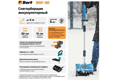 Батарея аккумуляторная Bort BA-20M 1427094 и Устройство зарядное Bort BC-1 1427097 приобретаются отдельно Тип Снегоуборщик аккумуляторный; Высота захвата 15 см; Ширина захвата 30 см; Высота в разложенном состоянии 1430 мм; Скорость холостого хода 2100 об/мин; тип двигателя Щеточный; Напряжение аккумуляторной батареи 18 В; Тип аккумуляторной батареи Li-Ion; Makita 18V LXT; Дальность выброса ...5 м; Количество скоростей 1 шт; Вес изделия 4 кг; Вес брутто=4,8 (Вес нетто=4,3) кг; 49,5 x 34,5 x 27; Дополнительная рукоятка; гарантия 2 г
