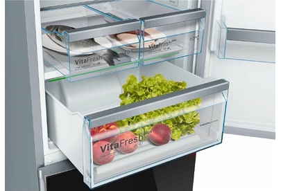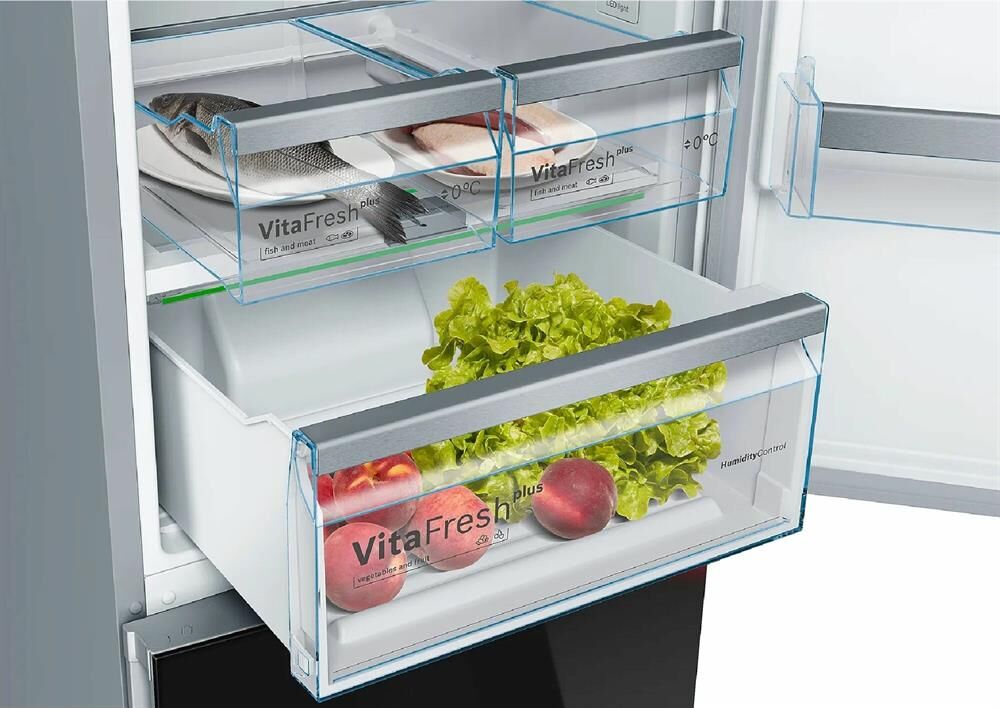 Количество камер: двухкамерный. Расположение морозильной камеры: снизу. Тип управления: электронное. Класс энергопотребления: A++. Система размораживания: No Frost. Общий объем холодильника: 435. Общий объем холодильной камеры: 330. Общий объем морозильной камеры: 105. Уровень шума: 40. Количество компрессоров: один. Хранение при отключении питания: 20. Мощность замораживания: 15. Количество полок: 4. Количество ящиков: 3. Материал полок: стекло. Система размораживания: No Frost. Тип: Холодильник. Хладагент: R600a. Количество ящиков: 2. Вес (нетто): 103.3. Количество дверей: 2. Тип компрессора: стандартный. Габариты упаковки (ед) ДхШхВ: 0.76x0.76x2.1. Вес упаковки (ед): 104.4. Количество полок на дверце: 4. Материал дверей: металл. Наличие морозильной камеры: есть. Тип дисплея: внешний. Направление открывания двери: вправо. Гарантия: 12 мес.. Цвет: черный. Потребление энергии: 303 кВт*ч/год. Размеры (ШхВхГ): 70 х 203 х 67 см. Особенности конструкции: перевешиваемые двери, регулируемые по высоте ножки. Индикац