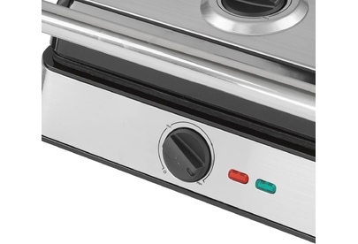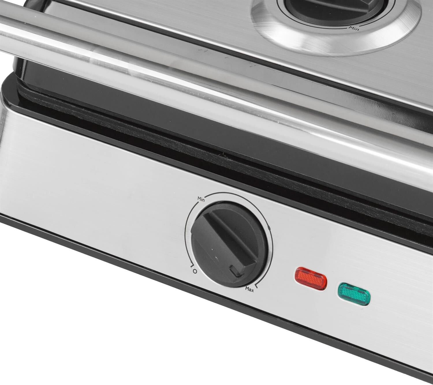 3 в 1: гриль, духовка, барбекю; мощность: 2200 Вт, тип управления: механическое, нагревательный элемент: нержавеющая сталь, регулировка температуры каждой панели, диапазон температур нагрева: 40-235 °С, материал корпуса: металл, бакелит, материал панелей: металл, антипригарное Non-Stick PRO, размер рабочей поверхности: 290 x 240 мм, количество панелей: 2, регулировка высоты, максимальный угол открытия крышки: 180°, индикатор нагрева. индикатор питания, съемный поддон для сбора масла/жира, длина шнура: 0.7 м, напряжение: 220-240 В, 50-60 Гц, защита от поражения электротоком: класс I
