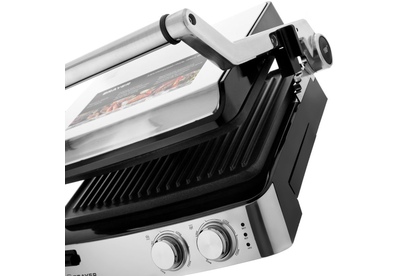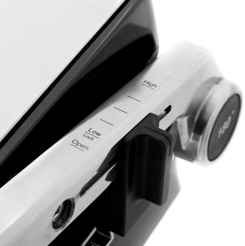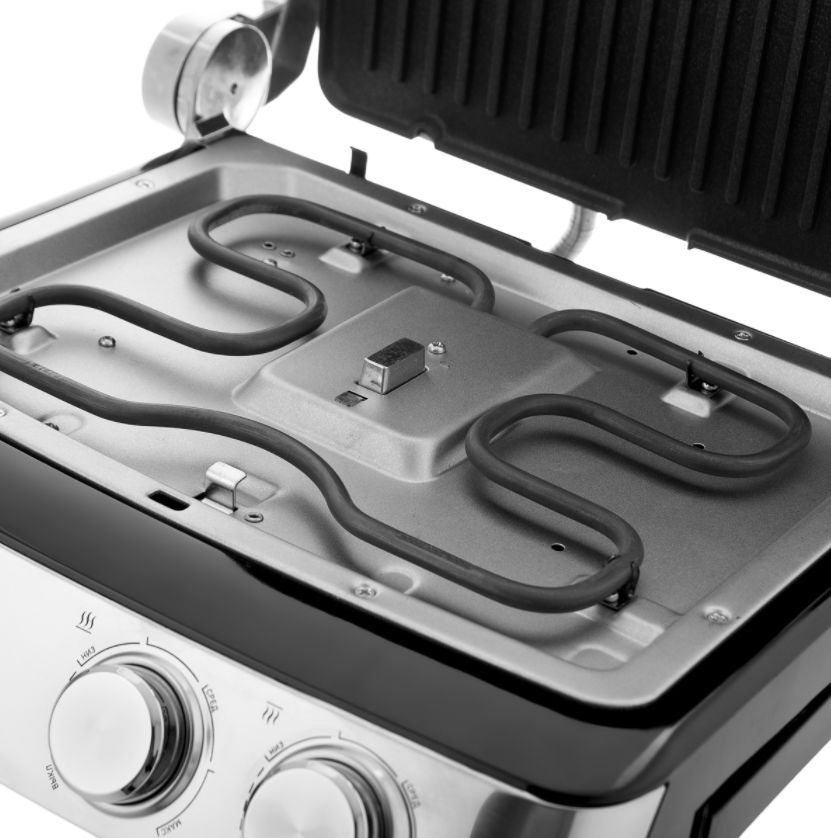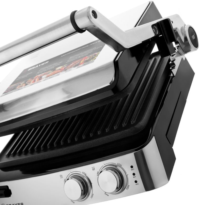 антипригарное покрытие, регулировка высоты верхней панели, поддон для сбора жира, съемные пластины