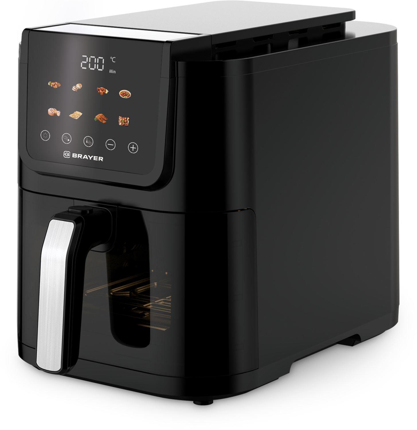 Мощность 1500 Вт Объем 5 л 8 программ: креветки, мясо, крылья, овощи, выпечка, фри, рыба, бекон Удлиненная корзина Корпус из высокопрочного термостойкого пластика Сенсорное управление LCD-дисплей Смотровое окно Регулировка температуры 40–200 °С Таймер до 60 мин Съемная решетка с антипригарным покрытием Электропитание 220-240 В, ~ 50-60 Гц