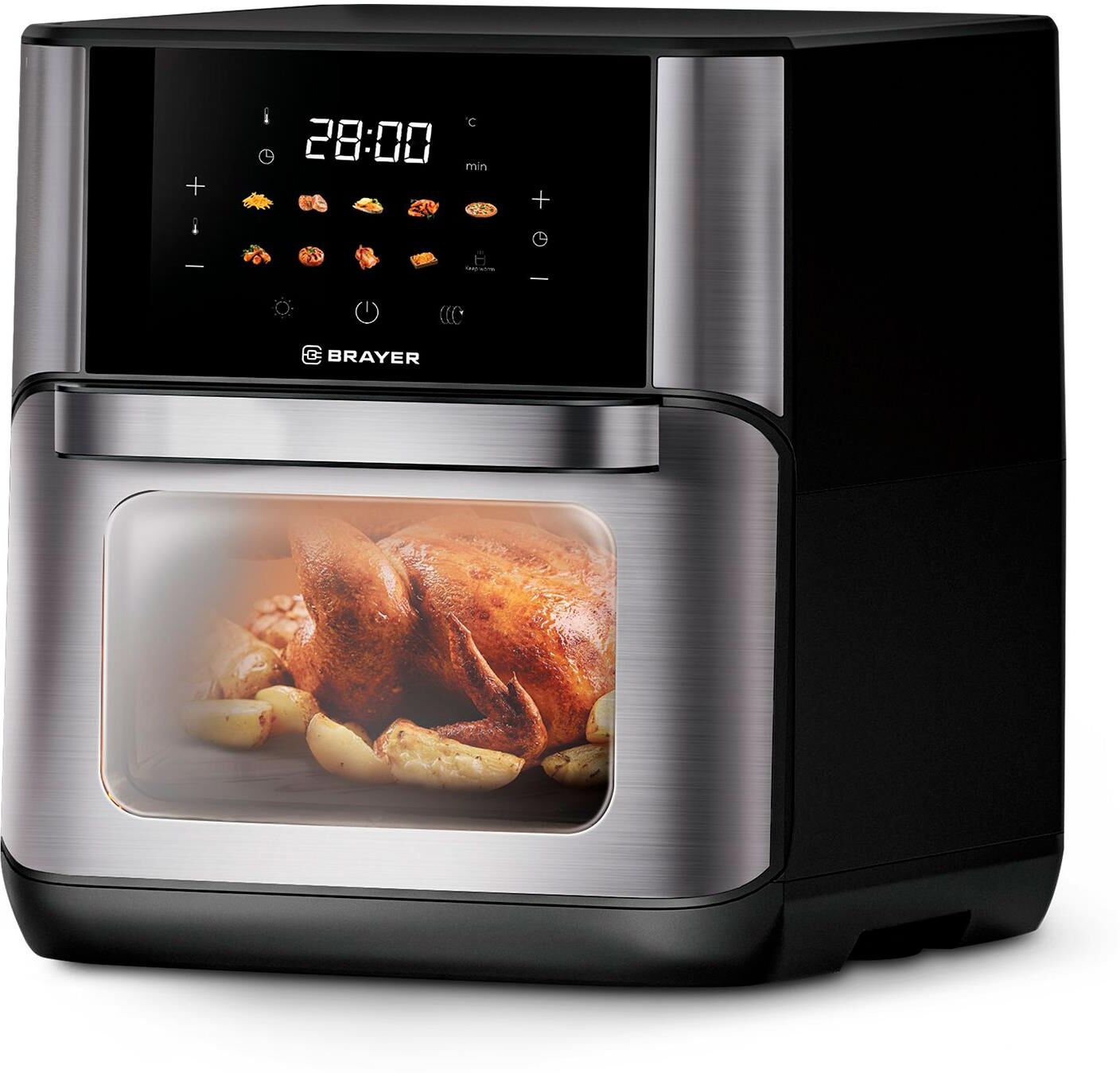 Мощность 1800 Вт Объем 12 л 10 программ: фри, мясо, рыба, морепродукты, пицца, голень, кекс, курица, сушка, подогрев Корпус из высокопрочного термостойкого пластика Функция подогрева пищи Сенсорное управление LED-дисплей Регулировка температуры 80–200 °С Таймер до 60 мин Аксессуары: -вертел -аэрофритюрница -поддон -поддон для барбекю -ручка для извлечения -решетка -шашлычница Звуковой сигнал готовности блюда Электропитание 220-240 В, ~ 50-60 Г