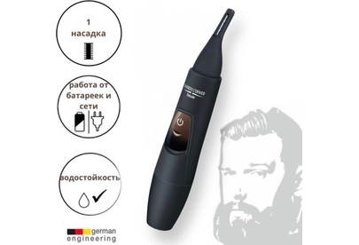 Количество насадок в комплекте: 1. Питание: от батарей AA. Особенности: Коррекция бровей и срезание волосков в носу и ушах. Высококачественное вертикальное лезвие из нержавеющей стали абсолютно не раздражает кожу.. Габариты упаковки (ед) ДхШхВ: 0.2x0.08x0.05. Вес упаковки (ед): 0.21. Материал/покрытие лезвий: сталь. Насадки: насадка-гребень, 3,6 мм. Способ регулировки длины: смена насадок. Гарантия: 12 мес.. Установка длины волос: от 3 до 6 мм. Цвет: черный. Дополнительная комплектация: защитная крышка для режущих лезвий, чехол. Дополнительные характеристики: промывка ножей под водой. Назначение: для бороды, для бровей и бакенбард, для носа и ушей, для усов. Количество насадок: 1 шт. Питание: от батарей AA. Особенности: промывка ножей под водой. Установка длины волос: от 3 до 6 мм