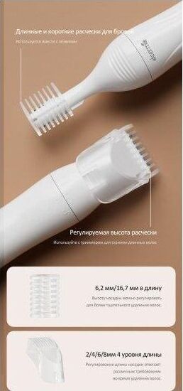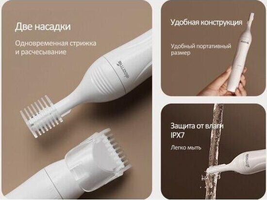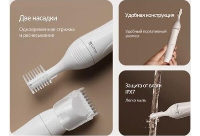 Многофункциональный триммер Мощность 3Вт Напряжение 1,5В Вес 57,2г Размеры 173х28х28мм Уровень водонепроницаемости IPX7 Комплектация: Триммер для волос, насадка-триммер для волос с расческой, насадка-машинка для стрижки длинных волос с расческой, насадка-щетка для волос, чехол.
