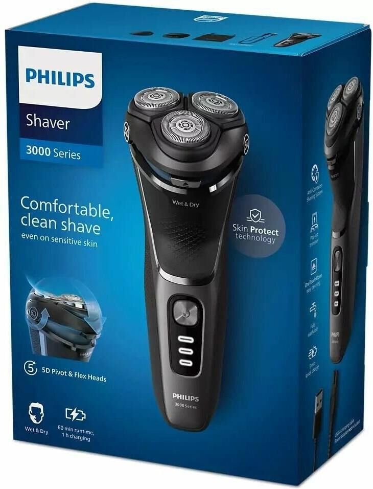 Тип бритвы: роторная. Кол-во бритвенных головок/сеток: 3. Плавающая головка бритвы: есть. Система электропитания: от аккумулятора. Время автономной работы: 60. Время полного заряда: 1. Габариты упаковки (ед) ДхШхВ: 0.14x0.08x0.19. Вес упаковки (ед): 0.53. Время быстрой зарядки для одного бритья: 5. Способ бритья: сухое/влажное. Тип аккумулятора: Li-ion. Гарантия: 12 мес.. Цвет: черный. Размеры (ШхВхГ): 65 х 150 х 60 мм. Дополнительная комплектация: зарядное устройство, защитная каппа (колпачек), подставка для зарядки, чехол. Индикация: остаточной зарядки, полной зарядки, разрядки. Функциональные особенности: быстрый заряд, повторение контуров лица, промывка ножей под водой. Конструктивные особенности: встроенный триммер, нескользящая рукоятка/вставка. Время полного заряда: 1 ч. Тип бритвы: роторная. Способ бритья: сухое/влажное. Бритвенных головок: 3 шт. Время автономной работы: 60 мин. Питание: от аккумулятора