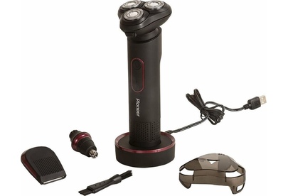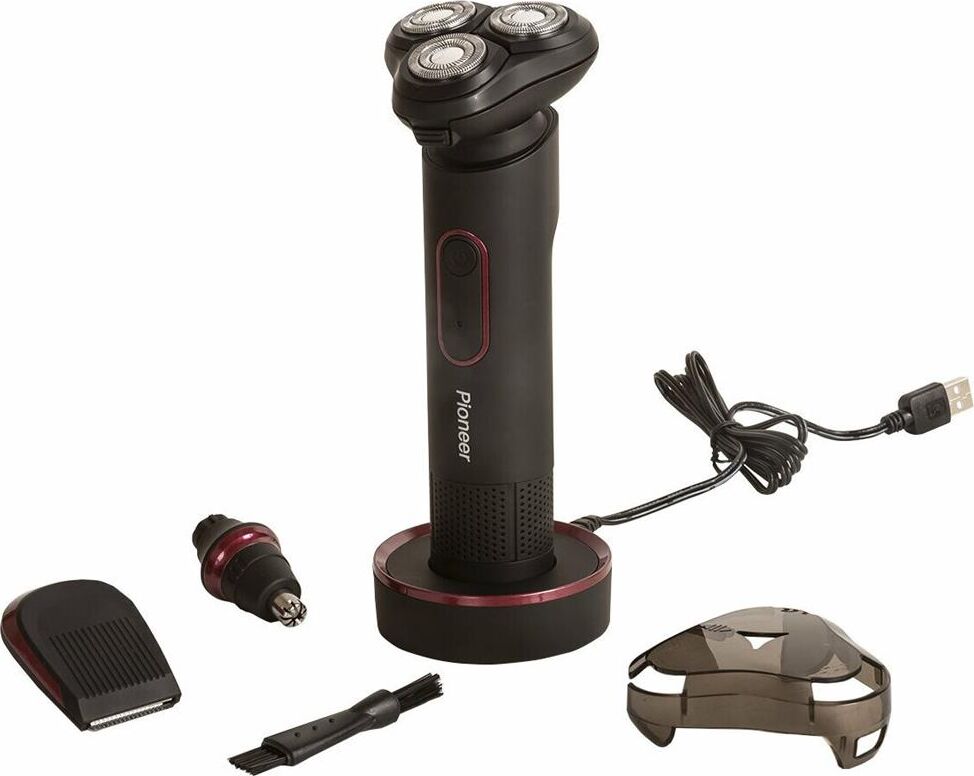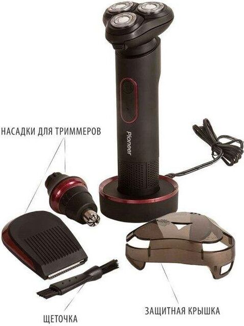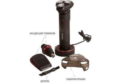 бритва, насадка-триммер для носа, насадка-триммер для подравнивания бакенбардов/усов/бороды, чистящая щеточка, USB кабель, подставка, защитная крышка, гарантийный талон, инструкция на русском языке