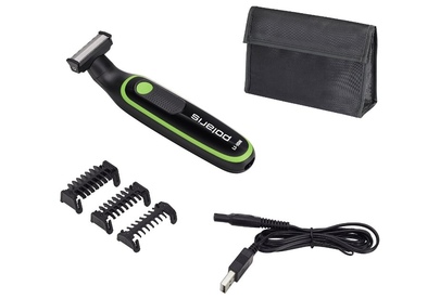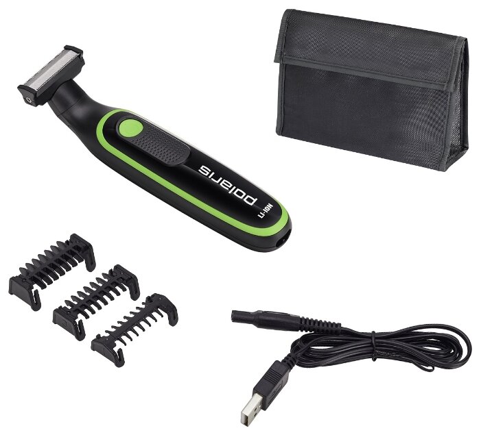 Li-ion батарея, возможность зарядки от USB, возможность бритья в душе, насадки 1, 3, 5 мм, масло, щеточка для чистки, сумочка для хранения в комплекте