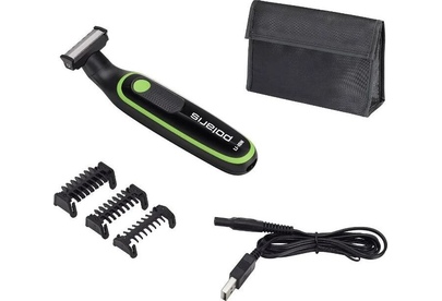Li-ion батарея, возможность зарядки от USB, возможность бритья в душе, насадки 1, 3, 5 мм, масло, щеточка для чистки, сумочка для хранения в комплекте