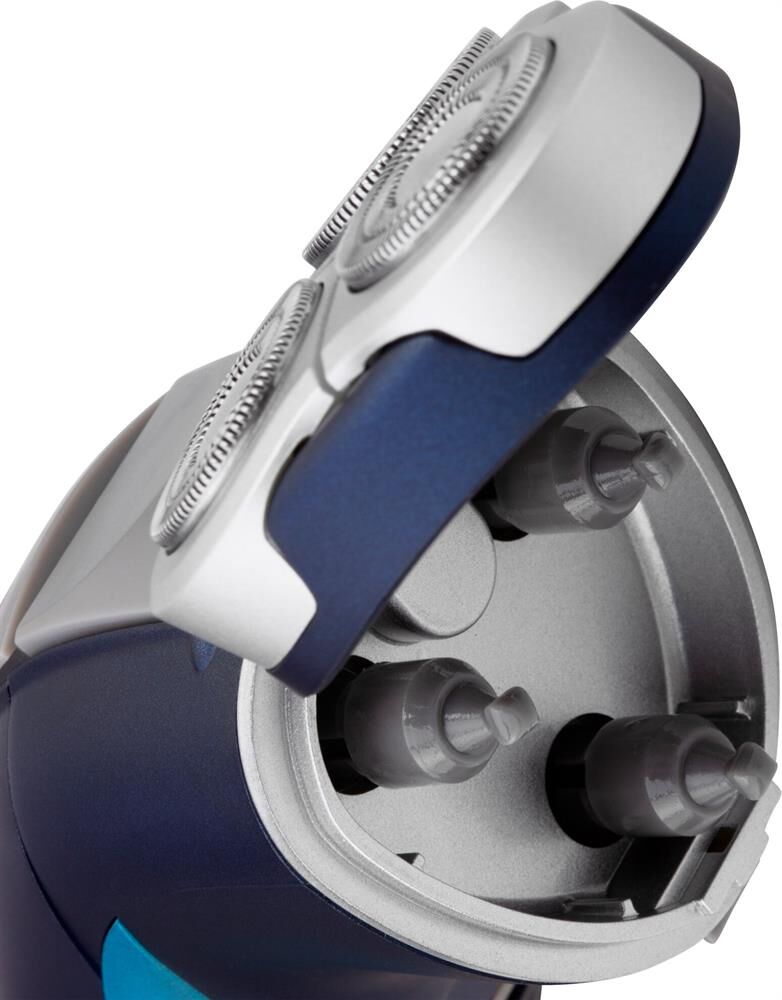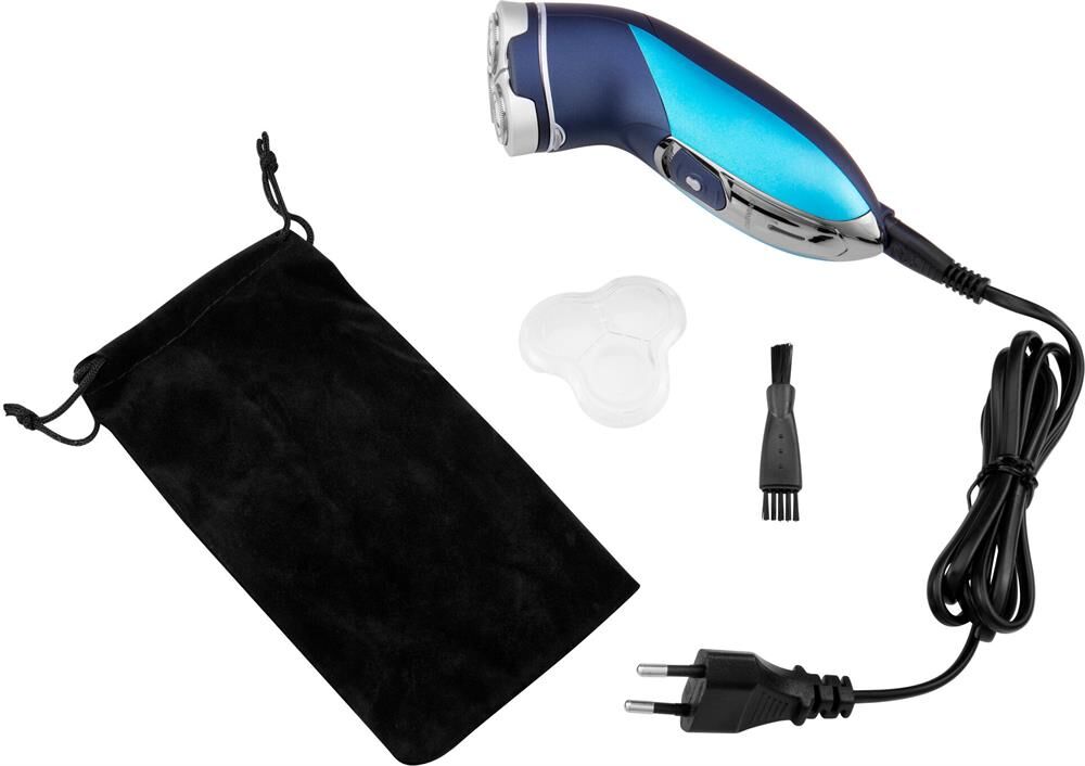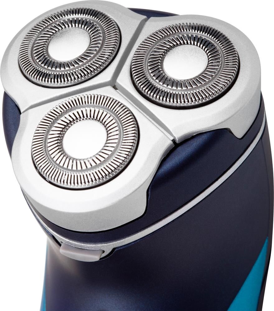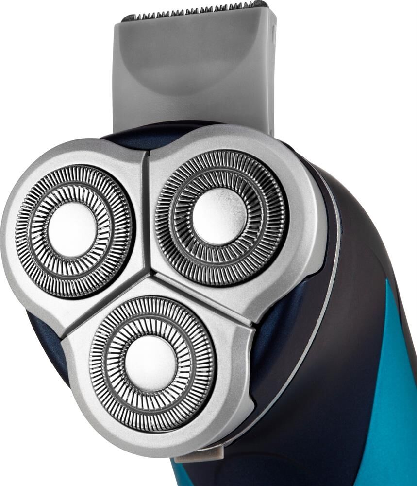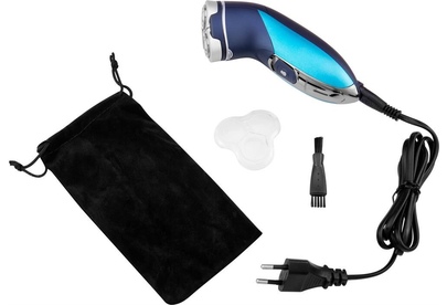 Бритва роторная. Способ бритья: сухое, Функциональные особенности: промывка ножей под водой, Конструктивные особенности: встроенный триммер, Индикация зарядки, Дополнительная комплектация: защитная каппа (колпачок), чехол, щеточка для чистки, Цвет: голубой/синий Кол-во бритвенных головок / сеток: 3 шт, Система электропитания от аккумулятора, Время автономной работы до 30 минут, Время полного заряда 8 часов, Срок гарантии: 12 месяцев.