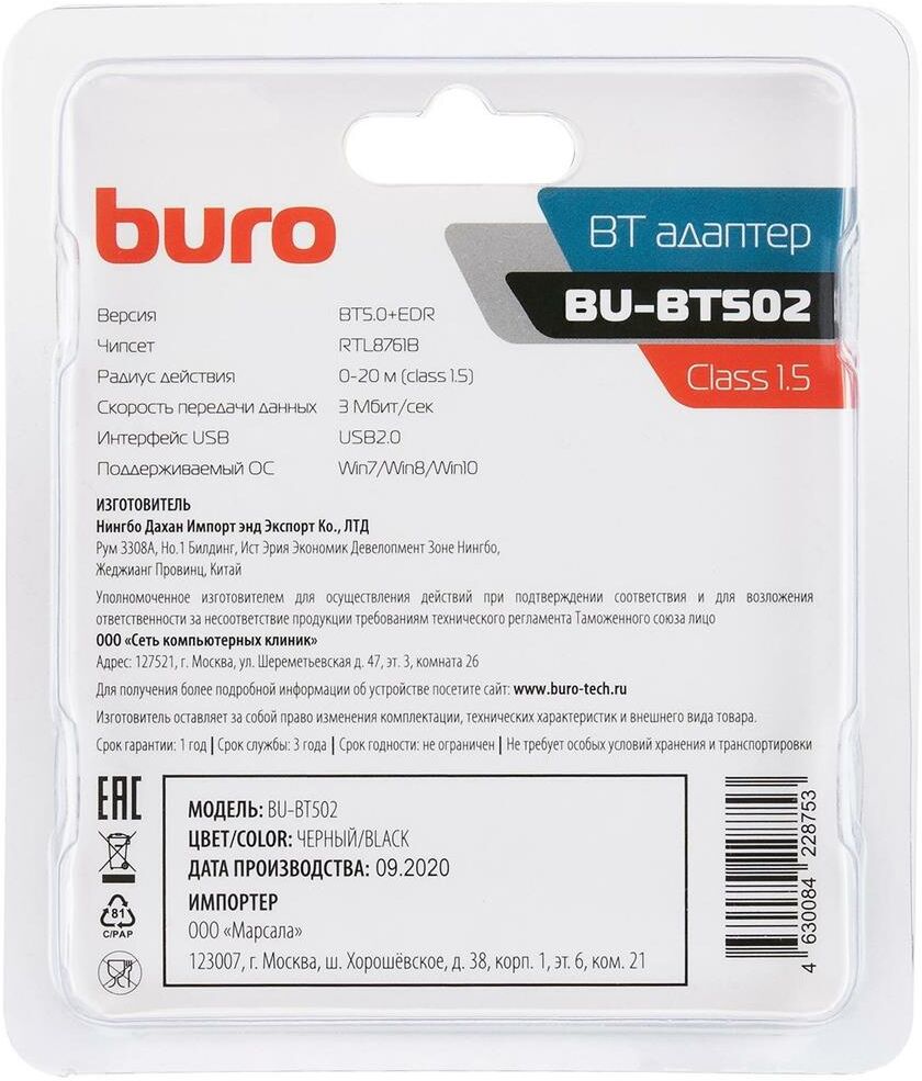 Бренд BURO Модель BU-BT502 Подключение USB Интерфейс USB USB2.0 Чипсет RTL8761B Стандарт Bluetooth Bluetooth 5.0+EDR Класс Bluetooth class 1.5 Скорость передачи данных 3 Мбит/с Радиус действия 20 м Поддерживаемые ОС Win7/Win8/Win10 Поставка Ret Цвет черный