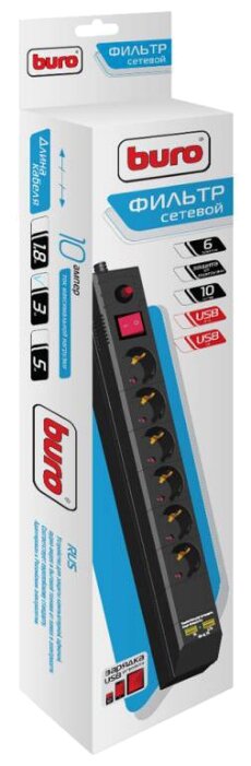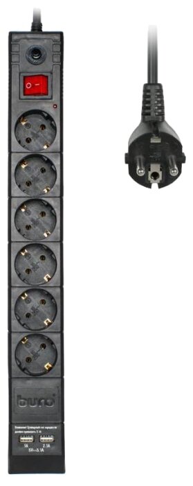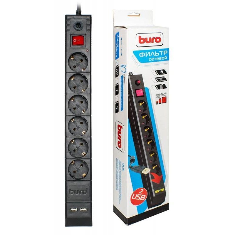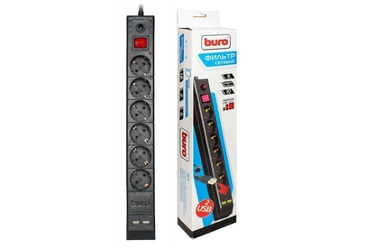 BURO BU-SP3-USB-2A-B 3м 6 розеток черный