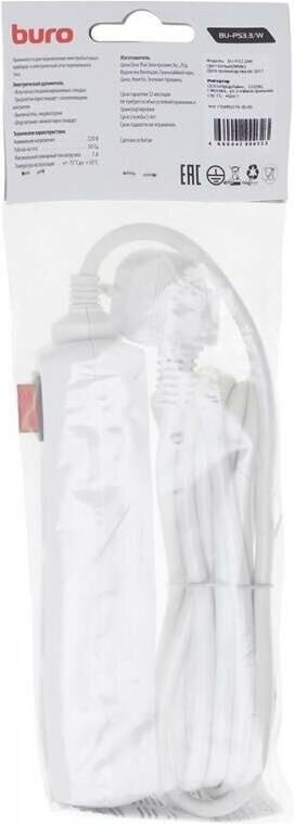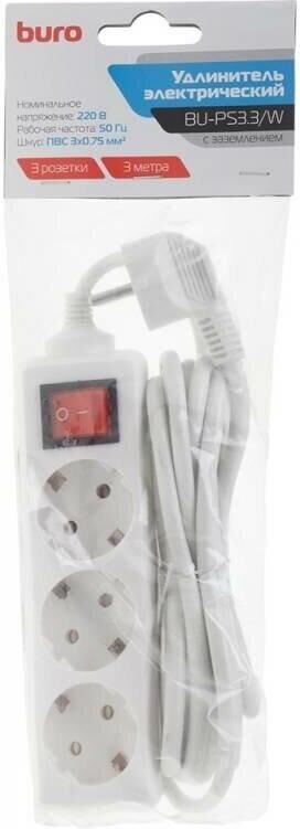 BURO Сетевой удлинитель BU-PS3.3/W 3м (3 розетки) белый (пакет ПЭ)
