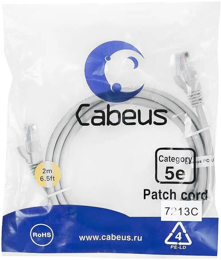 CABEUS Патч-корд PC-UTP-RJ45-CAT.5E-2M U/UTP RJ-45 вил.-вилка RJ-45 кат.5E 2м серый ПВХ