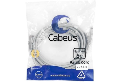 CABEUS Патч-корд PC-UTP-RJ45-CAT.5E-3M U/UTP RJ-45 вил.-вилка RJ-45 кат.5E 3м серый ПВХ