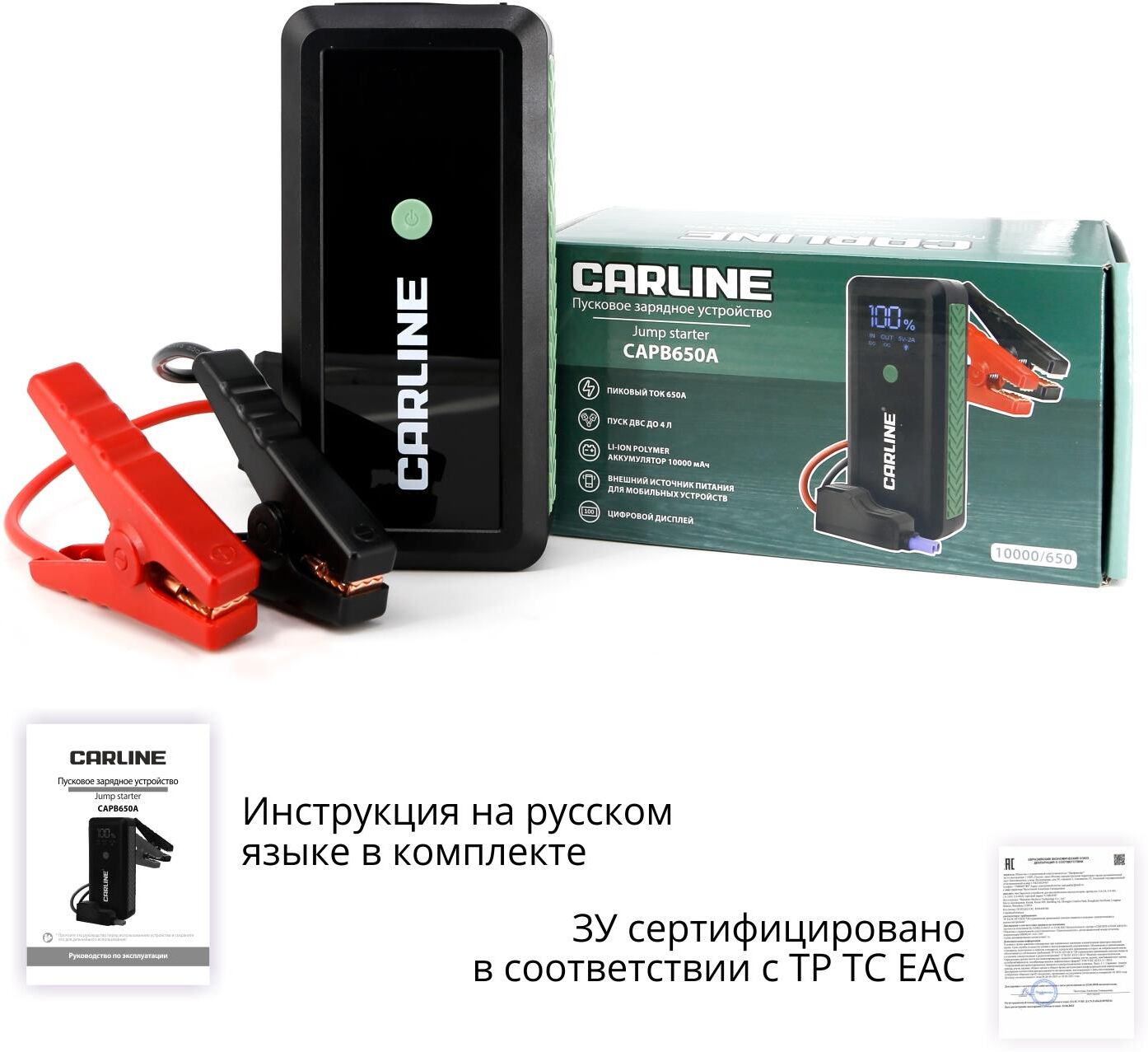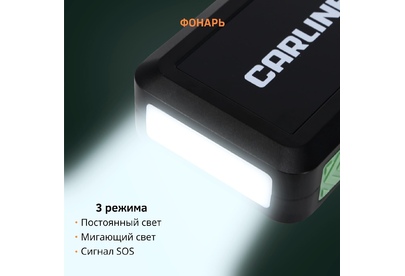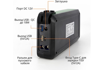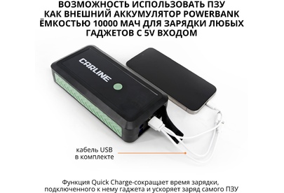 Усиленные медные зажимы «крокодил» с дополнительным защитным блоком с звуковой и световой индикацией сигнала ошибки • Многоуровневая защита от короткого замыкания и переполюсовки • Li-ion polimer аккумулятор класса +AAA • Цифровая индикация уровня заряда и типа подключения • Входной заряд через разъем Tipe-C с технологией Quick Charge (до 18W) • Функция PowerBank c 2-мя разъемами USB • Пусковое зарядное устройство • «Умные» стартовые провода с зажимами • Кабель USB • Инструкция по эксплуатации • Гарантийный талон • Входные параметры: Type-C (QС) - 5V/2A • Выходные параметры: USB 1 - 5V/2.1A USB 2 (QС)- 5V/3A, 9V/2A, 12V/1.5A • Ёмкость встроенного аккумулятора: 10000 мАч • Пиковый ток: 650А • Пусковое напряжение: 14,8 V • Тип встроенного аккумулятора: Li-ion polimer • Встроенный фонарик • Бренд: CARLINE • Страна производства: Китай • Материал: ABS пластик/металл