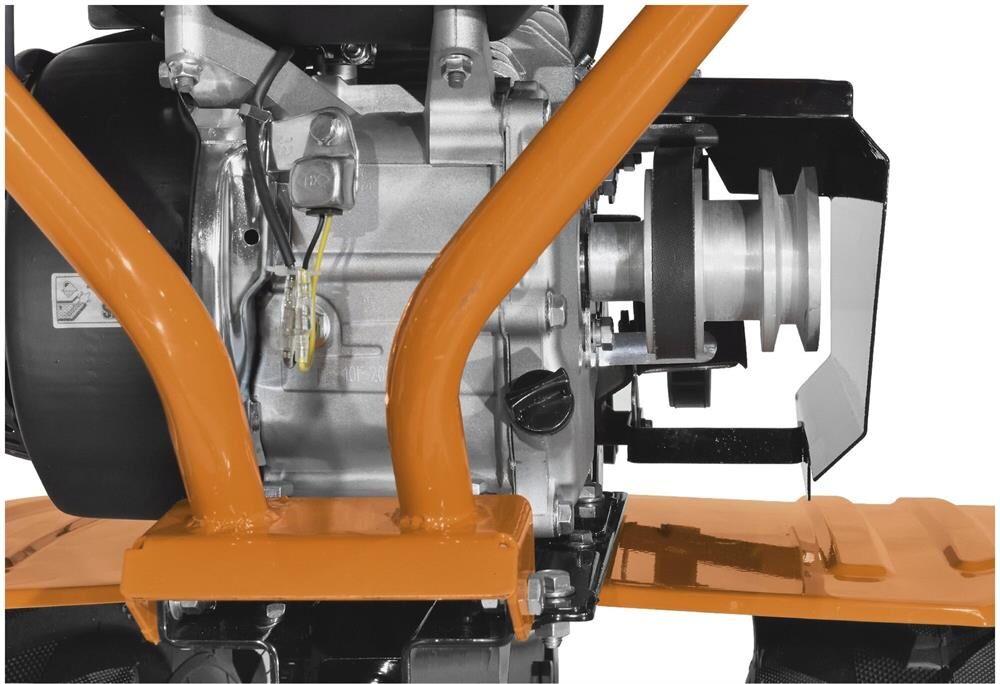 Тип: Мотоблок. Тип двигателя: бензиновый. Объем двигателя: 212. Ширина обработки: 850. Глубина обработки: 350. Запуск двигателя: ручной стартер. Коробка передач: механическая. Привод (редуктор): Шестеренчато-цепной. Сцепление: ременное. Объем топливного бака: 6. Тип топлива: АИ-92. Охлаждение двигателя: воздушное, принудительное. Комплект поставки: Мотоблок, универсальное сцепное устройство, кенгурятник, фрезы.. Вес: 84. Особенности: Усиленная рама, увеличенный до 6 л. объем топливного бака, универсальное сцепное устройство, фрезы в комплекте, размер колесных шин 19-7.00х8, кронштейн сошника выполнен путем гибки из цельного стального листа при полном отсутствии сварных швов, что повышает его прочность и устойчивость к коррозии.. Тип бензинового двигателя: 4-х тактный. Количество цилиндров: одноцилиндровый. Модель двигателя: EX210/6. Максимальная частота вращения вала: 3600. Объем масла двигателя: 0.6. Рекомендуемая марка масла двигателя: SAE10W30. Объем масла редуктора: 1.2. Рекомендуемая марка масла редуктор
