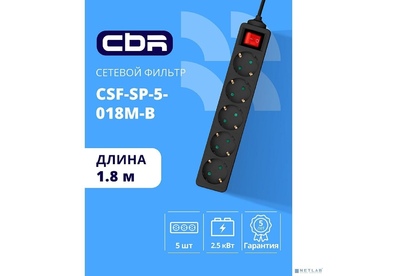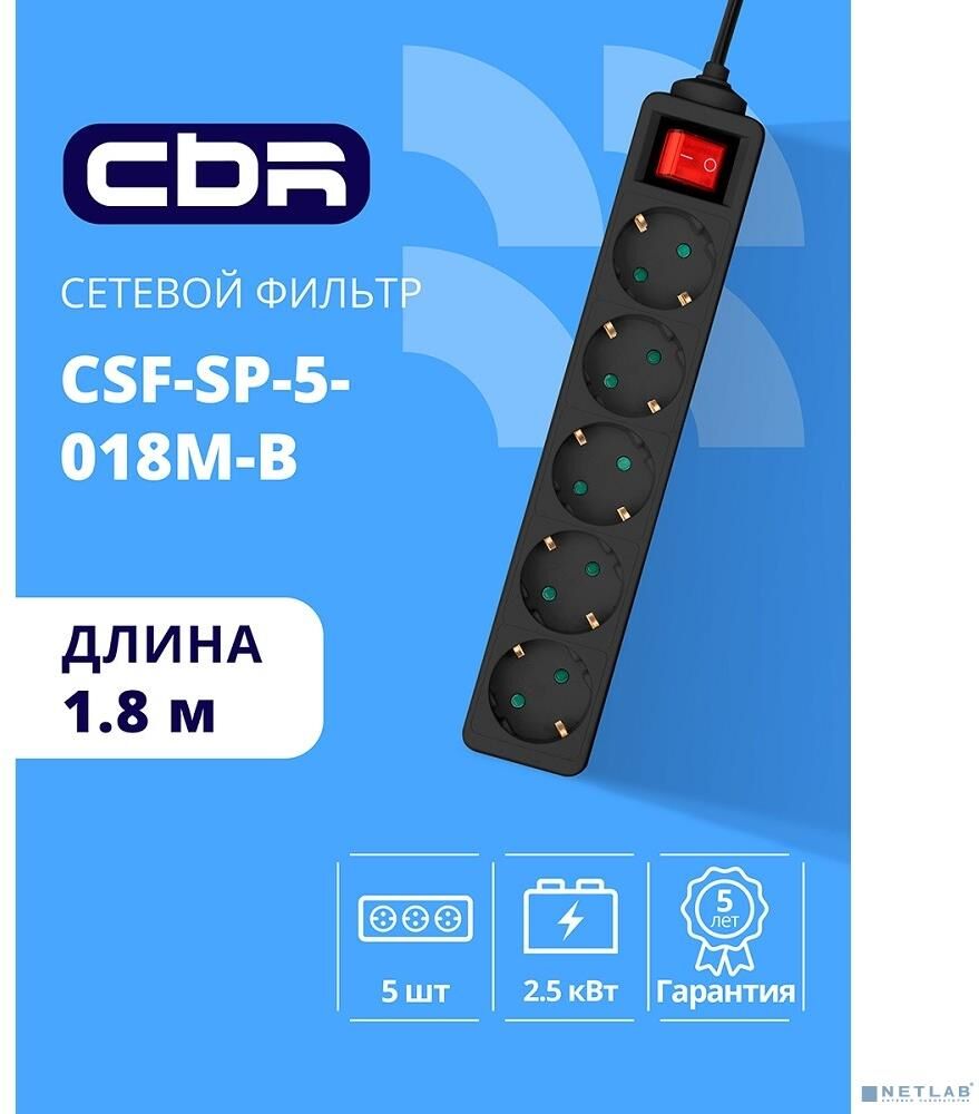 [сбр сетевые фильтры] CBR Сетевой фильтр CSF SP-5-018M-B, 10A, 5 евророзеток, защита от детей, 3x0.75 мм2, медь, 1.8 м, чёрный