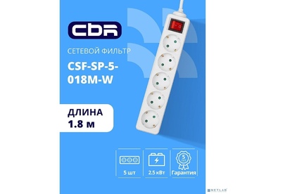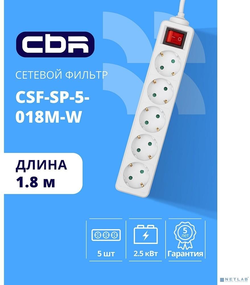 [сбр сетевые фильтры] CBR Сетевой фильтр CSF SP-5-018M-W, 10A, 5 евророзеток, защита от детей, 3x0.75мм2, медь, 1.8 м, белый