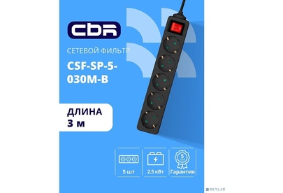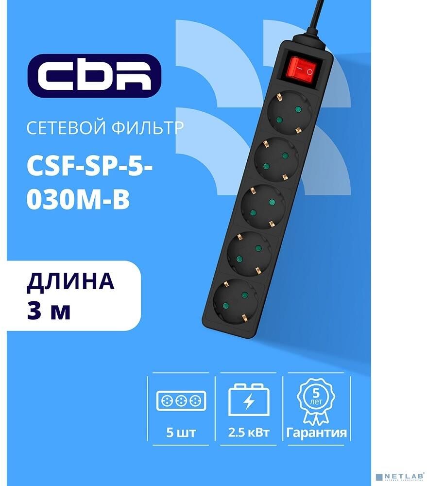 [сбр сетевые фильтры] CBR Сетевой фильтр CSF SP-5-030M-B, 10A, 5 евророзеток, защита от детей, 3x0.75мм2, медь, 3 м, чёрный