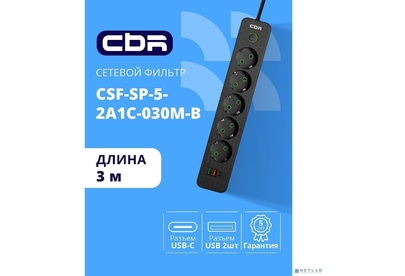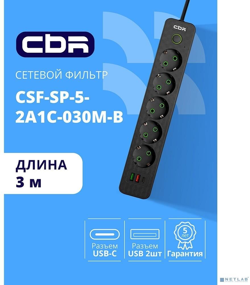 [сбр сетевые фильтры] CBR Сетевой фильтр CSF SP-5-2A1C-030M-B, 10A, 5 евророзеток, 2x USB Type-A 2.0, 1x USB Type-C, 3x0.75мм2, 3 м, чёрный