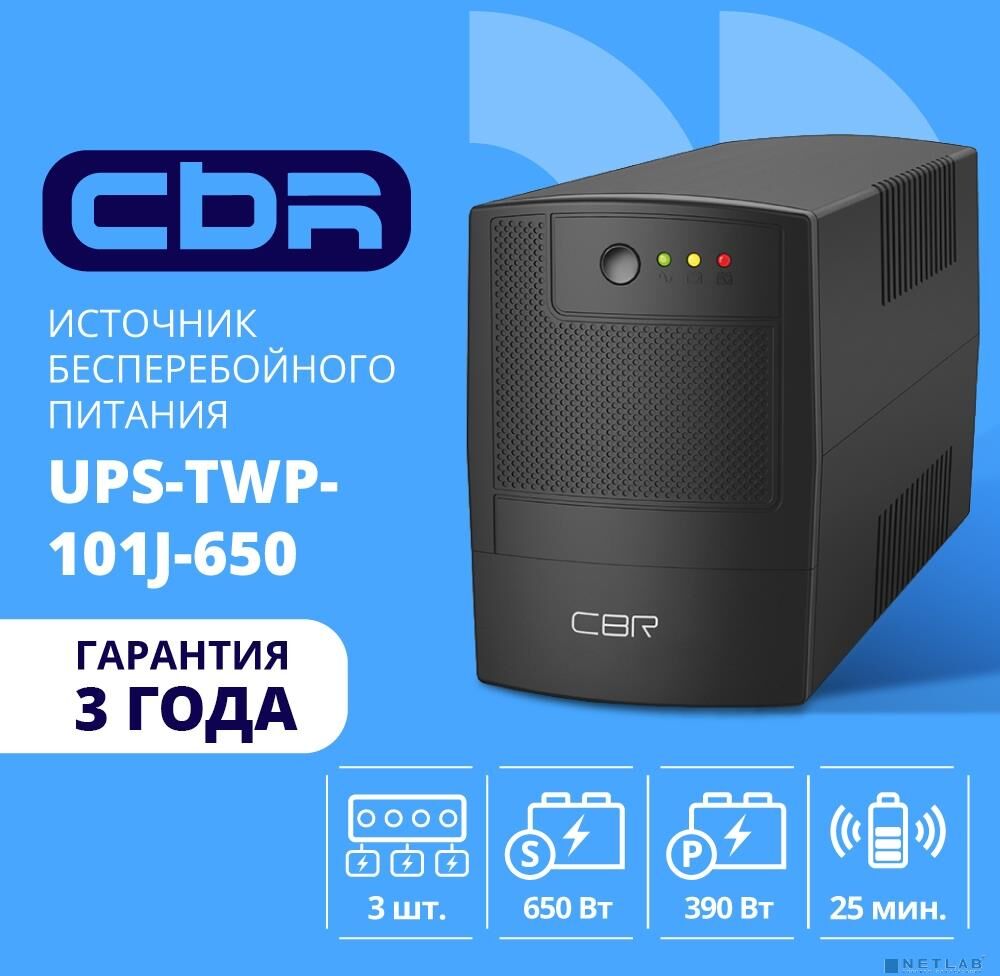 CBR TECH ИБП CBR [UPS-TWP-101J-650] 650VA/390W, Schuko CEE 7 x2 outlets, LED, AVR, SEC, 12V/7Ah