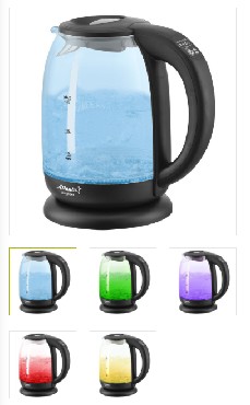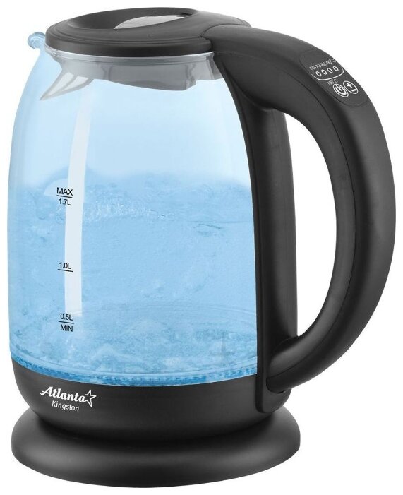 ATLANTA ATH-2532 (BLACK) 5 режимов нагрева - 60-70-80-90-100°С 5 цветов температурной иллюминации Объем 1,7 литра Корпус из термостойкого стекла Шкала уровня воды Поворот на подставке на 360° Быстрое закипание Фильтр от накипи Закрытый нагревательный элемент Автоматическое отключение Защита от перегрева без воды Электрошнур в цокольной подставке, 66см Мощность 1850-2200 Вт 220-240 B ~ 50/60 Гц