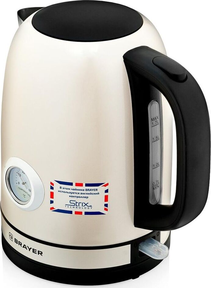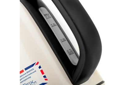Максимальная мощность 2150 Вт. Максимальный объём 1,7 л. Корпус из нержавеющей стали. Английский контроллер STRIX. Встроенный термометр. Встроенный фильтр от накипи. Индикатор уровня воды. Автоотключение при закипании воды. Отключение при отсутствии воды. Поворачивающийся на 360° корпус. Открытие крышки путём нажатия на кнопку. Электропитание 220-240 В., ~50-60 Гц.