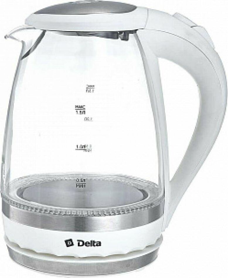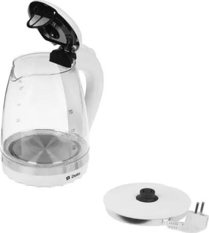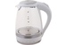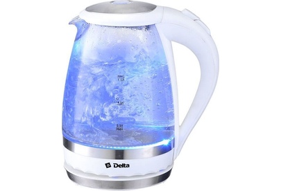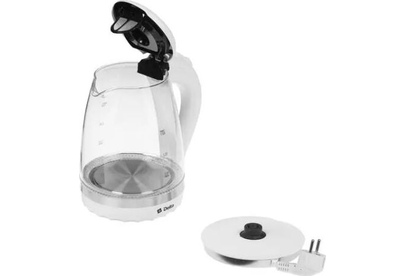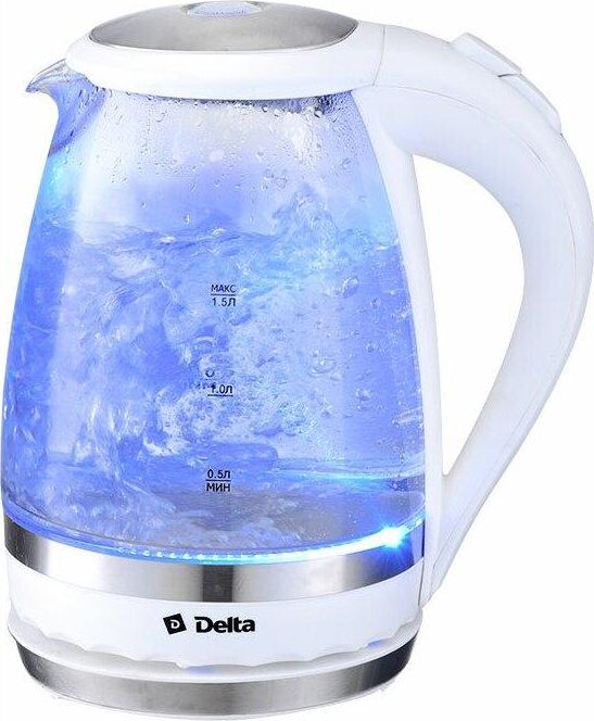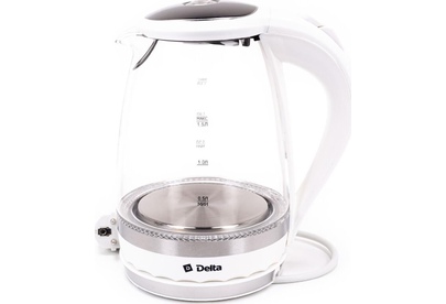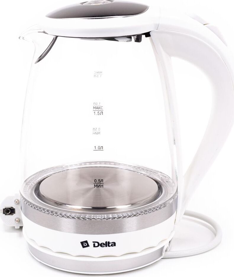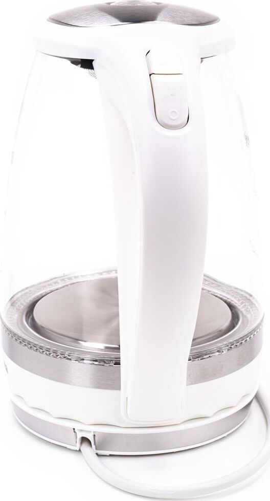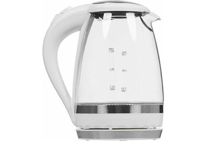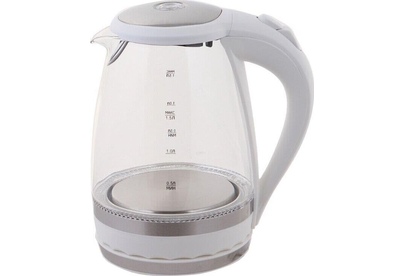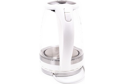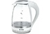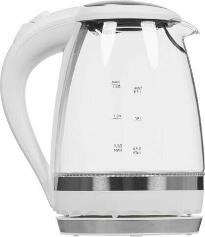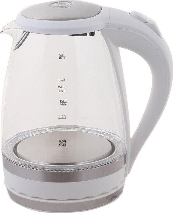Макс. мощность 2200 Вт. Объем 1,5л. Закрытый нагревательный элемент из нерж. стали. Корпус из жаропрочного стекла. Вращение корпуса на 360°. Шкала уровня воды. Внутренняя LED-подсветка. Многоуровневая защита: автоматич. отключение при закипании, отключение при снятии чайника с базы, отключение при недостаточном количестве воды.