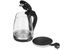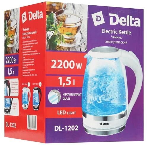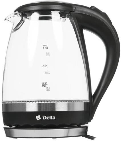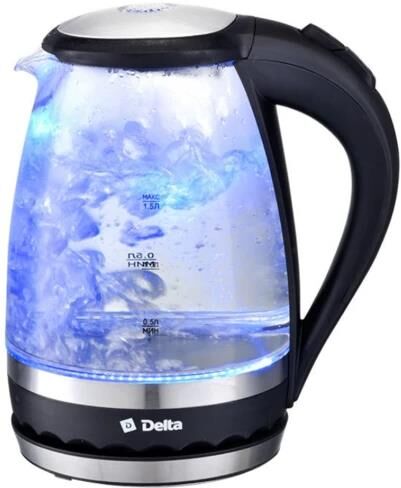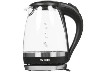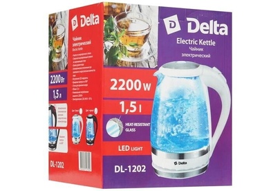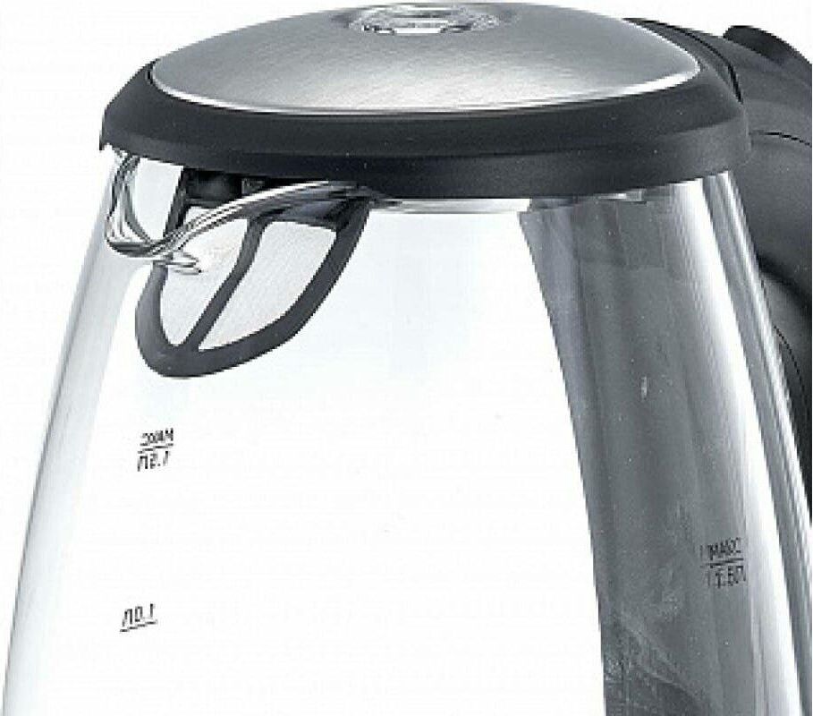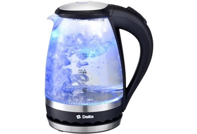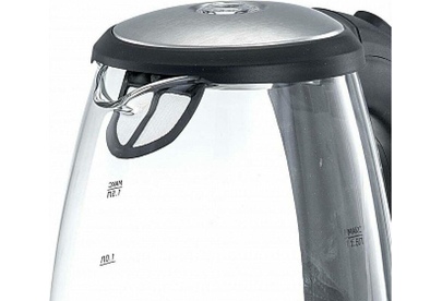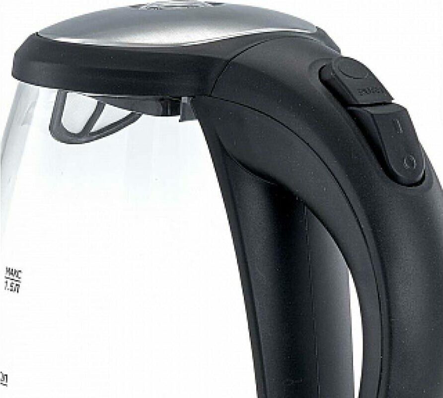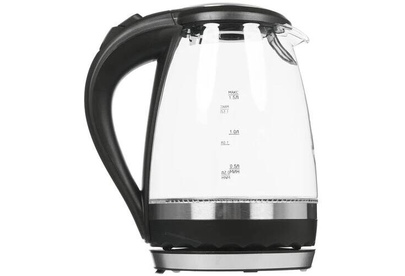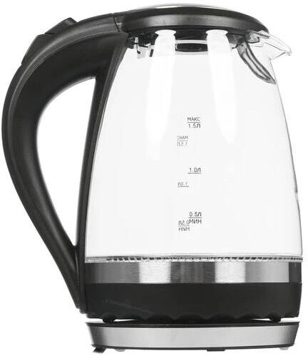 Макс. мощность 2200 Вт. Объем 1,5л. Закрытый нагревательный элемент из нерж. стали. Корпус из жаропрочного стекла. Вращение корпуса на 360°. Шкала уровня воды. Внутренняя LED-подсветка. Многоуровневая защита: автоматич. отключение при закипании, отключение при снятии чайника с базы, отключение при недостаточном количестве воды.