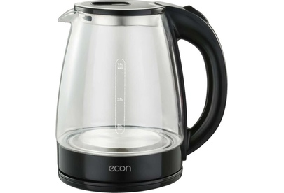 Чайник стеклянный, дисковый нагревательный элемент, емкость 1,8 литра, мощность 1500 Вт, подсветка при включении, автоматическое отключение при закипании, защита от включения без воды, цвет корпуса: черный