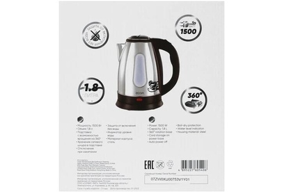 Максимальный объем, л. 1,8. Тип нагревательного элемента диск. Способ открывания крышки вручную. Подставка с вращением на 360? есть. Хранение сетевого шнура в подставке есть. Отключение при закипании есть. Отключение при отсутствии воды есть. Индикатор уровня воды есть. Комплектация чайник, гарантийный талон, инструкция на русском языке. Материал корпуса нержавеющая сталь. Цвет сталь с черными вставками. Потребляемая мощность, Вт. 1500. Электропитание, В., Гц. 220-240, 50.