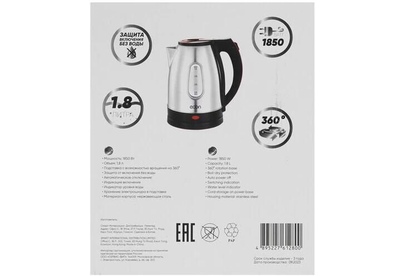 Чайник металлический, Мощность 1850 Вт, объем 1.8 литра, Окно, Дисковый нагревательный элемент, Отключение при закипании, Отключение при отсутствии воды, Встроенный фильтр.