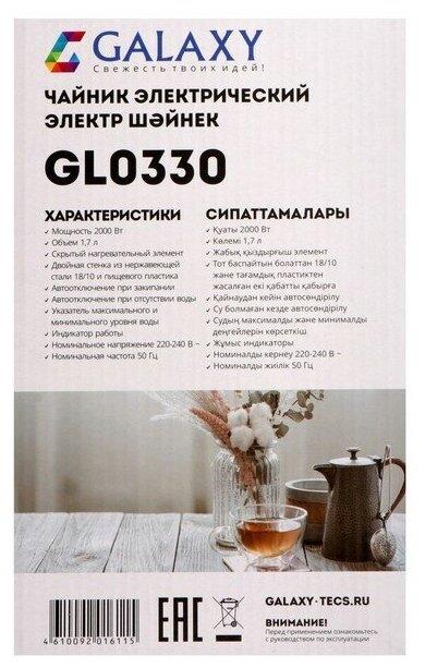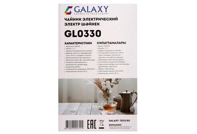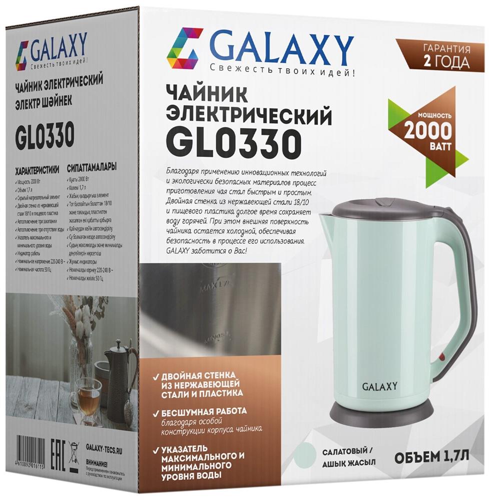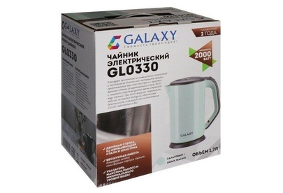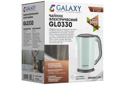 GALAXY GL 0330 САЛАТОВЫЙ Номинальная потребляемая мощность 2000 Вт Объем 1,7 л Скрытый нагревательный элемент Двойная стенка из нержавеющей стали 18/10 и пищевого пластика Автоотключение при закипании Автоотключение при отсутствии воды Указатель минимального и максимального уровня воды Индикатор работы Длина шнура питания 78 см