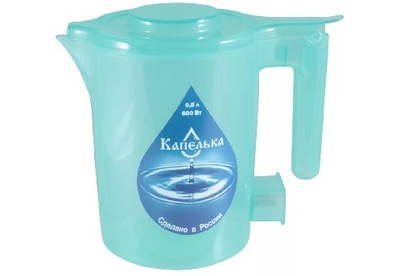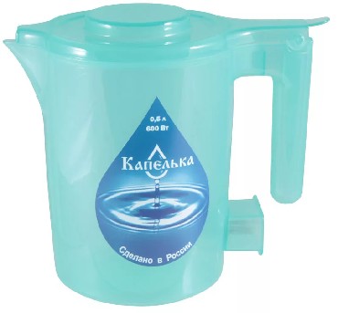 Объем 0.5 л, мощность 600 Вт, нагревательный элемент – открытая спираль, длинна шнура - 0,7 м. материал корпуса: пластик.